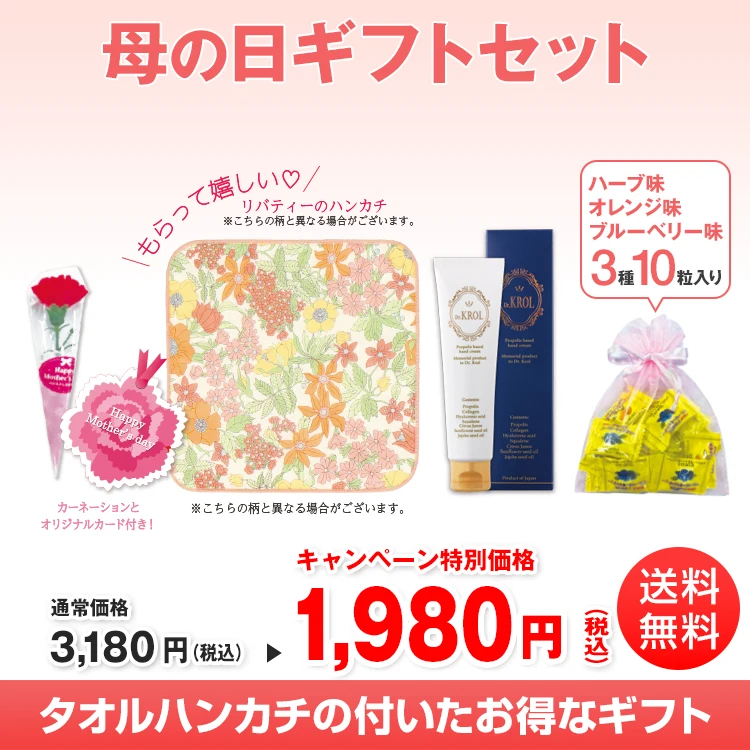 今年の母の日は、「プロポリスキャンディー」と荒れた手の修復力が高いと評判の「ハンドトリートメント」にイギリスリバティ社の使い勝手の良いタオルハンカチをセットにいたしました。貰ってうれしい毎日使えるギフトです。感謝の気持ちを込めてお届けいたします。カーネーション(造花)とカードが付きます。